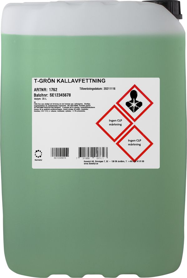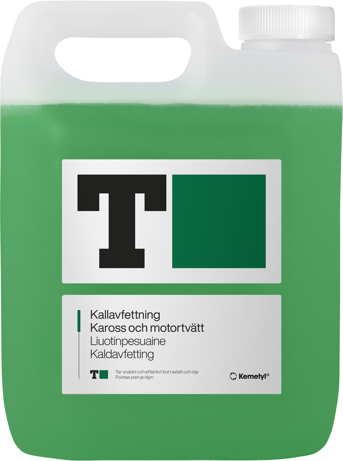Nordiska vintervägar med mycket smuts sätter speciella krav på våra avfettningsprodukter. T-Grön Kallavfettning är en välbeprövad klassiker som är anpassad för de hårda nordiska vinterförhållandena och levererar ett bra rengöringsresultat. T-Grön Kallavfettning är ett petroleumbaserat avfettningsmedel som effektivt och snabbt rengör bilens kaross från föroreningar av asfalt, tjära, olja, fett, vägsalt med mera.