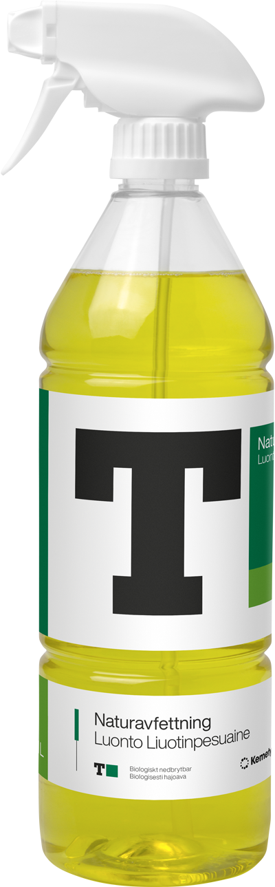 T-Grön Naturavfettning är ett vattenbaserat avfettnings- och rengöringsmedel. Tack vare den speciella sammansättningen och ett anpassat tensidpaket har produkten en mycket god rengöringsförmåga som löser både olje- och vattenlöslig smuts. T-Grön Naturavfettning är något alkalisk och avlägsnar enkelt feta eller oljaktiga fläckar.