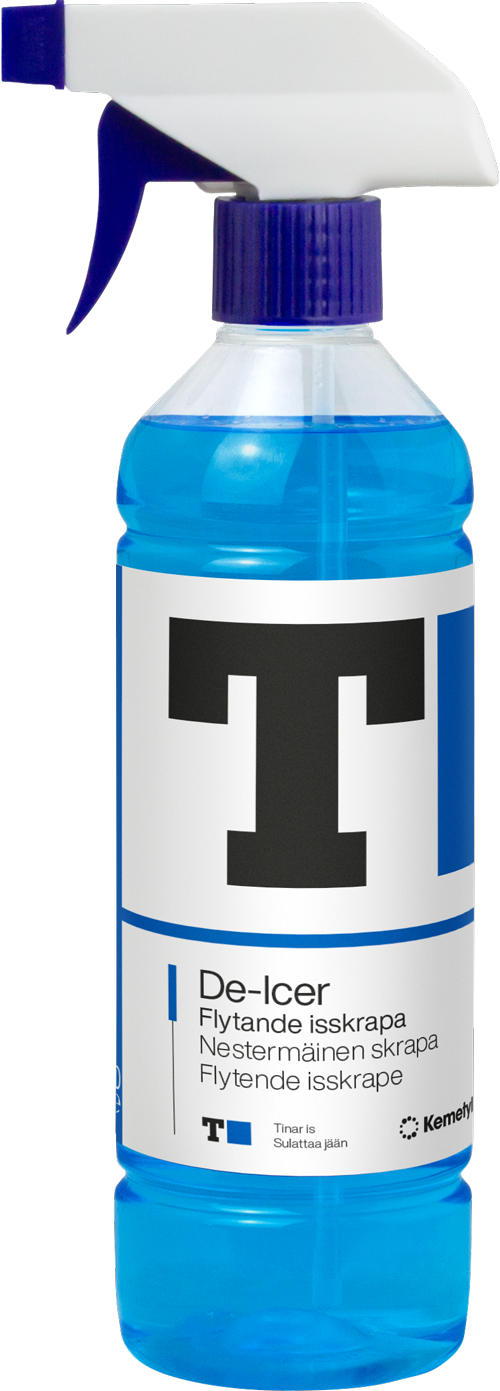 T-Blå® De-Icer Flytande isskrapa är en användbar produkt som underlättar arbetet med isiga rutor och minskar risken för skrapskador på glas och lister. Den smälter effektivt isen på vindrutan och övriga bilrutor och ger bättre sikt. T-Blå® De-Icer är särskilt framtagen för att undvika skador på torkarblad, gummitätningar och lack.