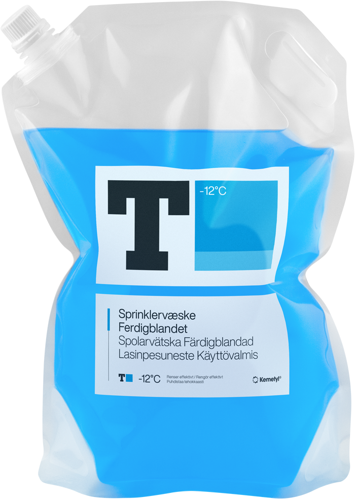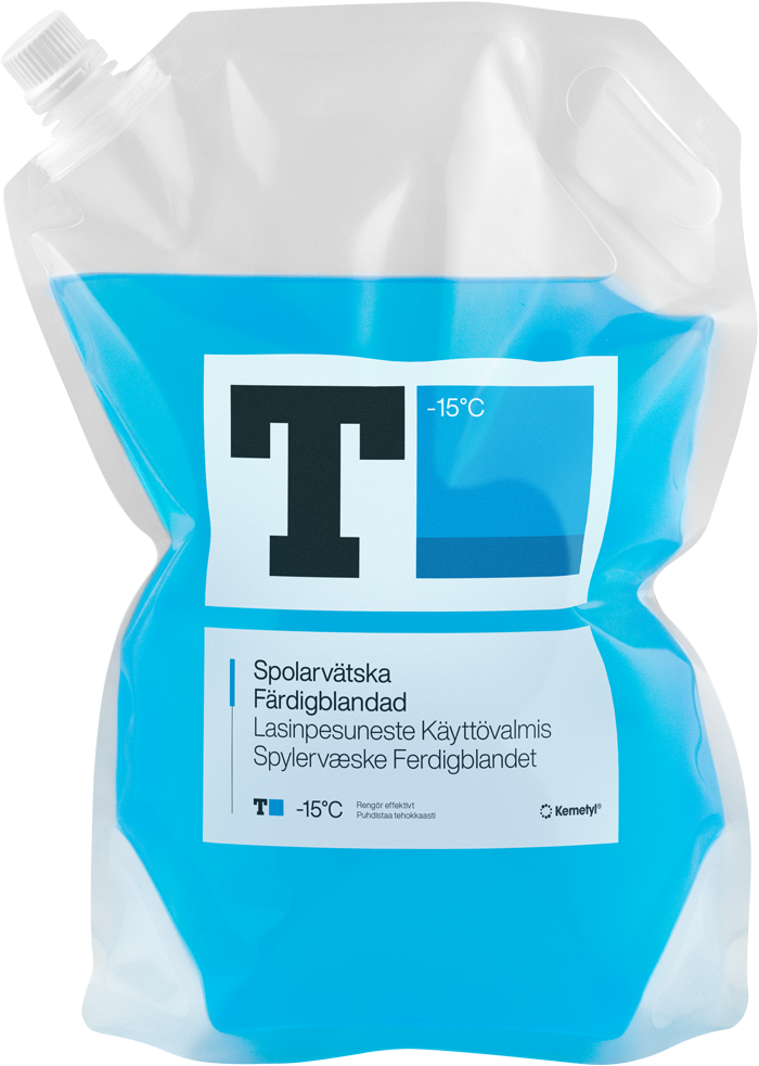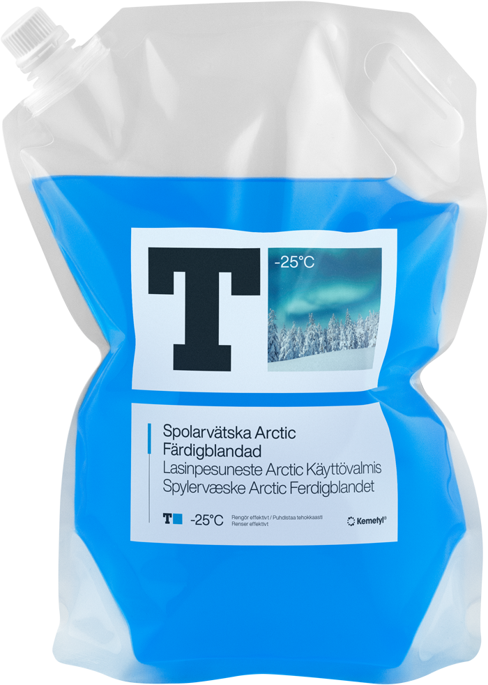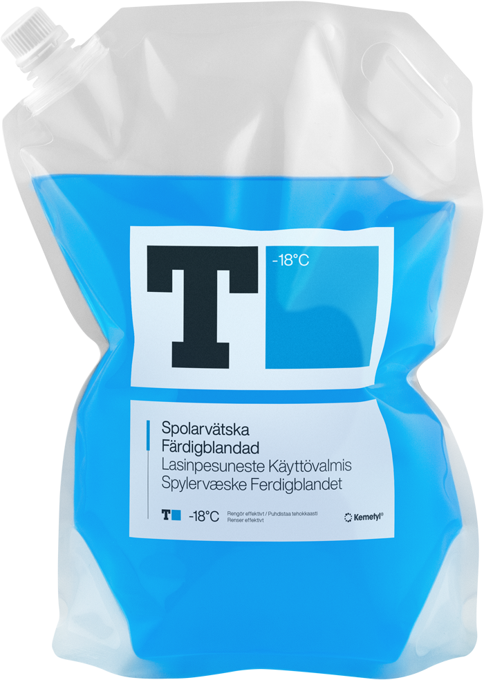 Produkttyp: Konsumentprodukt. Bilvård. Färdigblandad spolarvätska med frysskydd ned till -18 grader. I den senaste generationens förpackning – påse gjord i monomaterial, optimerad för förpackningsåtervinningen och av 22% återvunnen plast.
